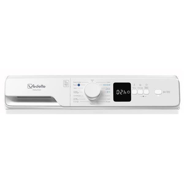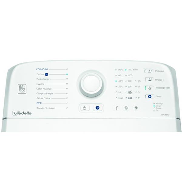 Lave-linge top Vedette VLT1255W2 - Intuitif, ce lave-linge top de 5,5 kg s’adapte parfaitement aux petits espaces tout en offrant des performances fiables - Sa vitesse d’essorage de 1200 tr/min assure un linge bien essoré et plus rapide à sécher - Avec ses 9 programmes, il s’occupe de tous les textiles du quotidien : coton, délicat, laine, petite charge, et un cycle Express 39 min idéal pour rafraîchir rapidement du linge peu sale - Le programme Hygiène élimine jusqu’à 99,9 % des bactéries grâce à un lavage à plus de 60 °C pendant 30 minutes, pour un linge parfaitement propre et sain - La fonction Favori permet d’enregistrer vos réglages préférés pour un accès direct à votre cycle habituel - Ses options pratiques comme le départ différé jusqu’à 12 h, le prélavage, le rinçage + ou le repassage facile facilitent la vie au quotidien - Doté d’un tambour inox de 42 L et d’une capacité variable automatique, il ajuste la consommation d’eau selon la charge - Ce modèle est équipé de sécurités anti-balourd et anti-débordement pour une utilisation sereine.