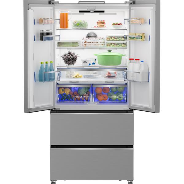 Réfrigérateur 2 portes & 2 tiroirs Beko B3RGNE544ZXP - Avec un volume total impressionnant de 510 litres dont 353 litres pour la réfrigération et 157 litres pour la congélation - Ce modèle bénéficie d’un froid ventilé NeoFrost Dual Cooling avec technologie AEROflow pour une température homogène et moins de déshydratation - La technologie HarvestFresh utilise un éclairage LED tricolore pour préserver 100% des vitamines A et C de vos fruits et légumes - Il est équipé d’un compartiment fraîcheur 0-3°C pour conserver viandes et poissons dans des conditions optimales ainsi que d’un compartiment Everfresh+ pour prolonger la durée de vie des fruits et légumes - En matière d’organisation vous disposez de 4 clayettes verre premium 6 balconnets larges et 2 bacs à légumes - Le congélateur offre 2 tiroirs spacieux et un bac à glaçons - Son fonctionnement ultra silencieux à seulement 35 dB en fait un allié discret au quotidien - Côté commandes l’écran LED tactile en façade facilite les réglages - Pose-libre avec des dimensions de 182,3 x 83,2 x 70 cm il est habillé d’un élégant inox anti-traces avec poignées intégrées finition métal pour une intégration parfaite dans votre cuisine.
