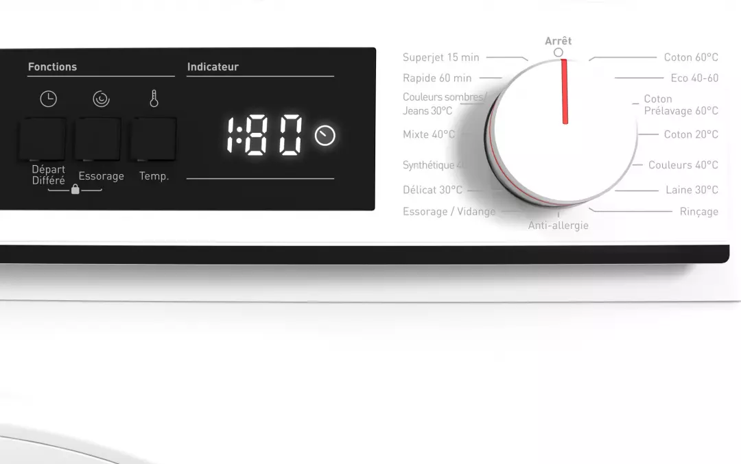 Programmes spéciaux Coton prélavage, Couleurs, Anti-allergie, Essorage/Vidange, Mix, Super Jet 15 min